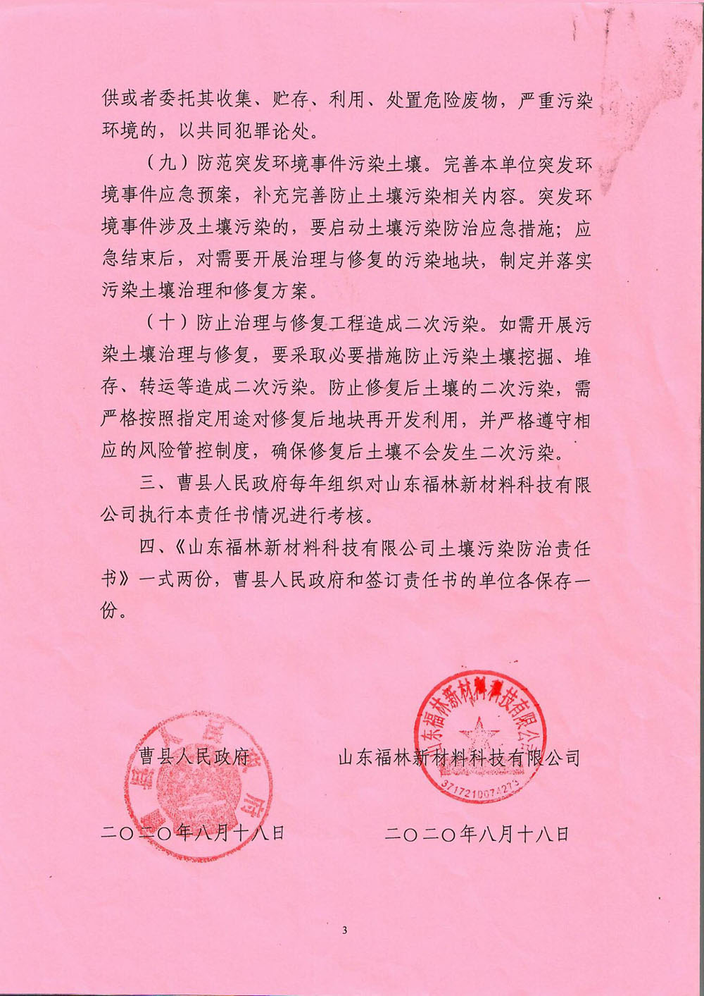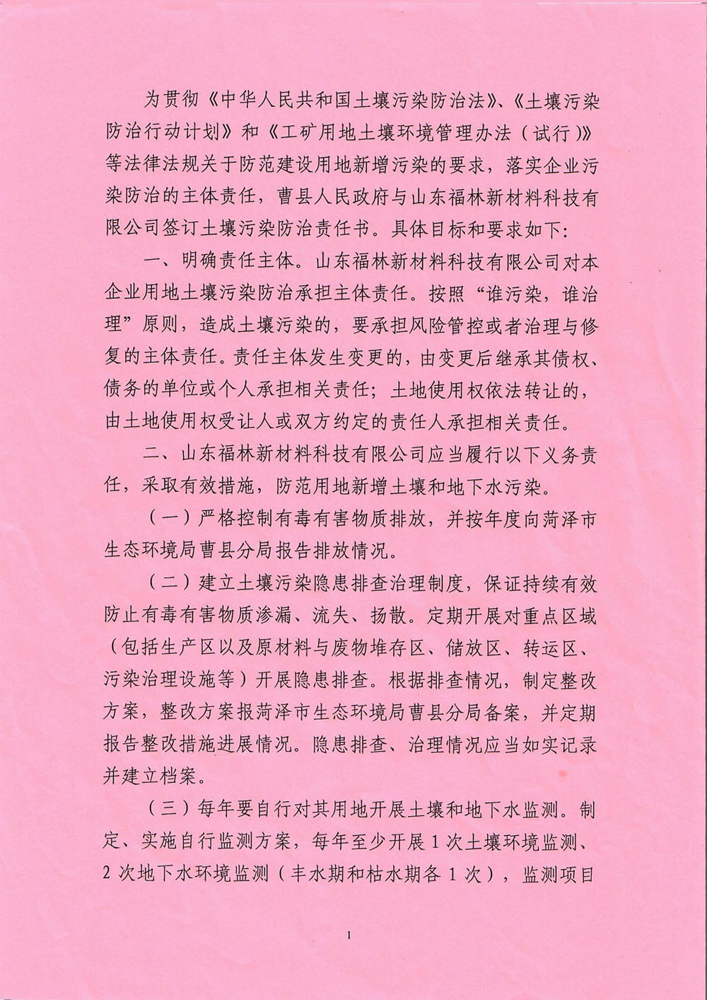 山东福林新材料科技有限公司土壤污染防治责任书